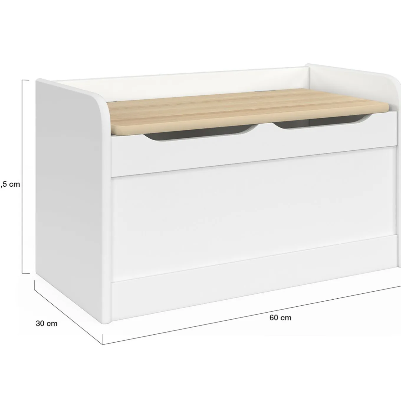 Banc coffre de rangement enfant LOGAN 60 cm en bois blanc et hêtre