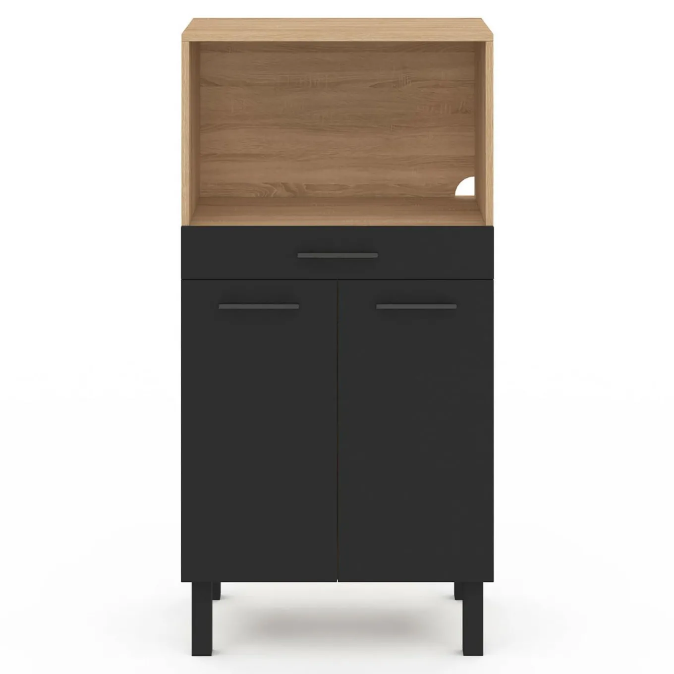 Buffet mi-haut de cuisine pour micro-onde 60 cm CINA 1 tiroir 2 portes façon hêtre et noir