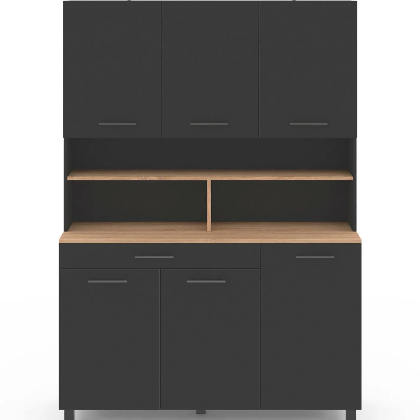 Buffet de cuisine 120 cm CINA 6 portes + tiroir noir et plateaux façon hêtre