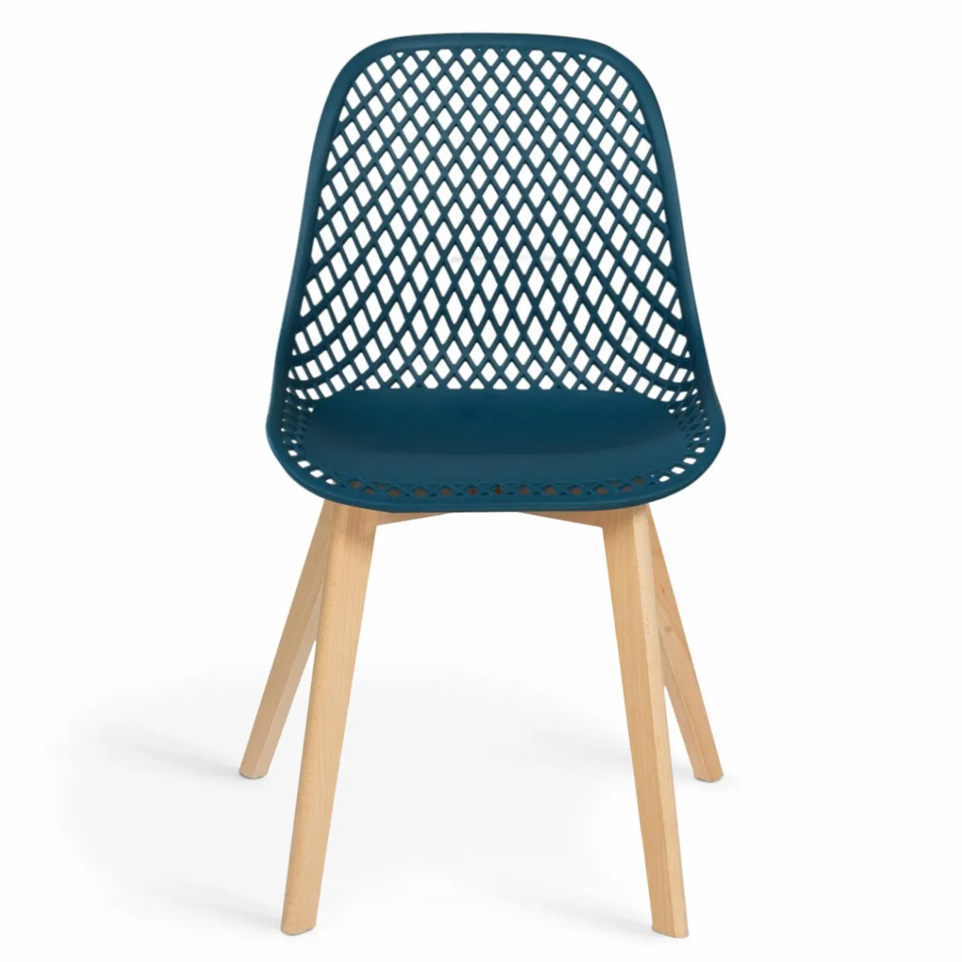 Le dossier ajouré de ces chaises bleu x2, blanc, gris clair et gris foncé x2 vous séduira pour son style à la fois graphique et élégant. Les pieds en bois offrent par ailleurs un esprit suédois, à tout petit prix !