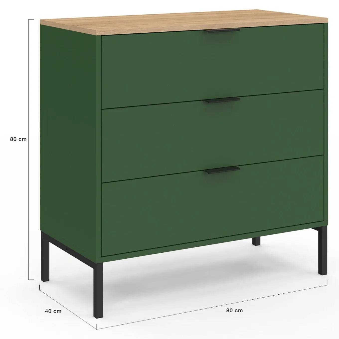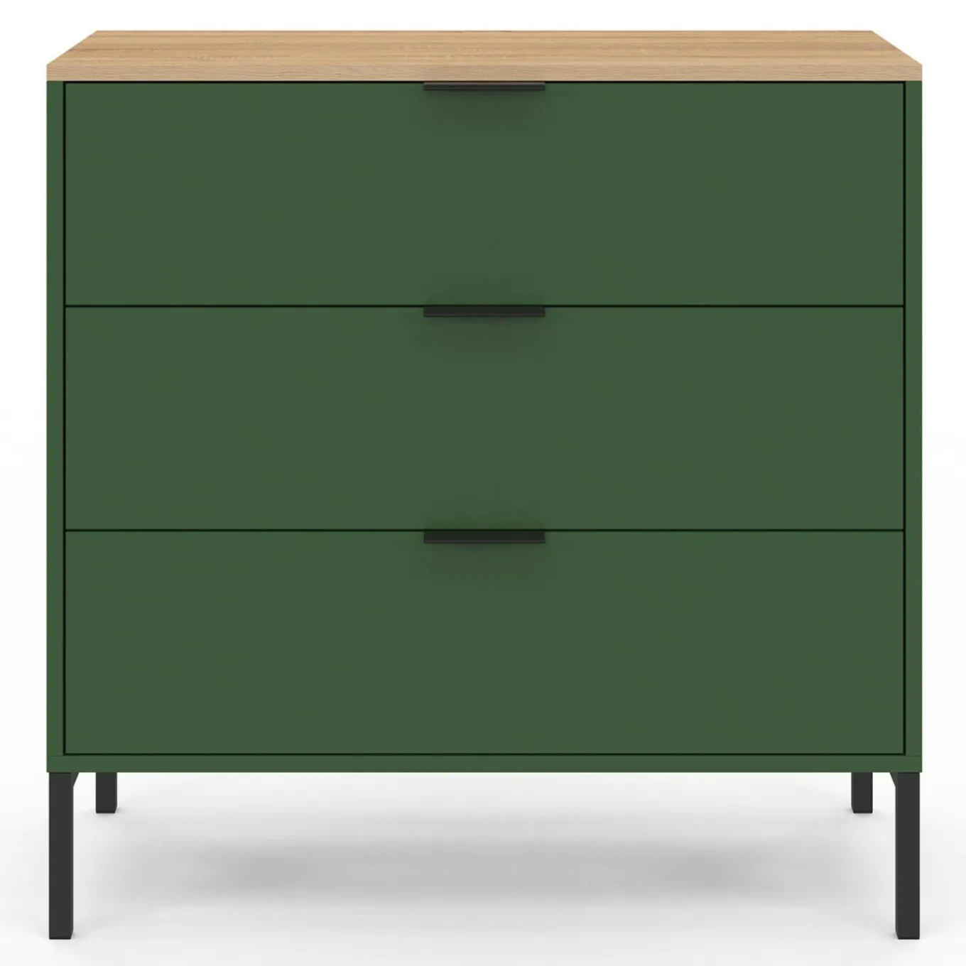 Commode 3 tiroirs KELIA 80 cm vert kaki et plateau bois