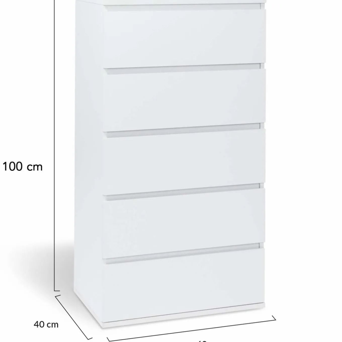Envie d’un joli chiffonnier pas cher ? Découvrez le chiffonnier TOMI en bois blanc et ses 5 tiroirs pratiques. Profitez de 5 grands espaces de rangement pour protéger vos vêtements et votre linge à l’abri de la poussière. Accédez facilement à vos affaires avec ses jolies poignées intégrées et ses tiroirs coulissants. Un meuble aussi design que pratique, à saisir maintenant !
