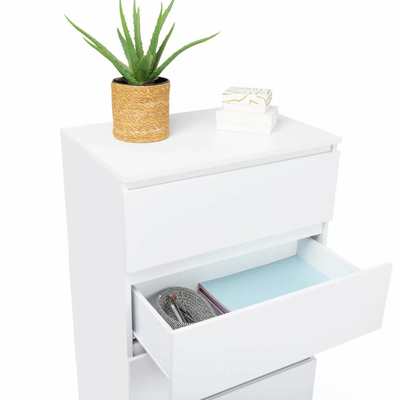 Utilisez la commode 5 tiroirs blanche pour organiser vos affaires de manière efficace, en utilisant un tiroir pour chaque type de vêtement ou de linge, par exemple. Vous pouvez aussi trier vos affaires selon la saison.