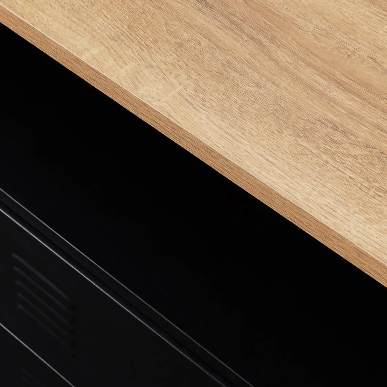 La couleur noire, classique et intemporelle de cette commode 4 tiroirs 115 cm, associée au plateau au coloris façon hêtre, chaleureux, lui permet de s’accorder à n’importe quelle décoration intérieure, pour un look sobre et élégant. Cette commode industrielle 4 portes en métal noir peut trouver sa place dans un bureau, une chambre ou un salon.