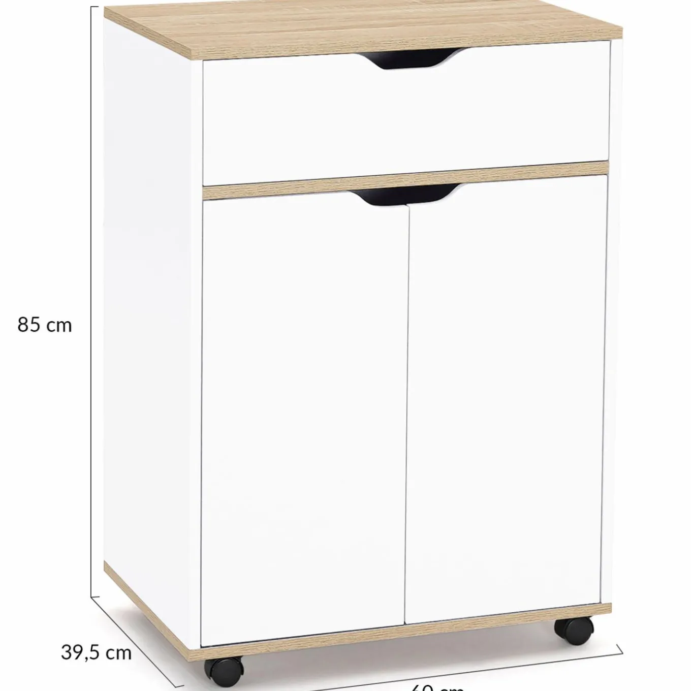 Desserte de cuisine COSY placard avec tiroir bois blanc et plateaux façon hêtre L.60 CM