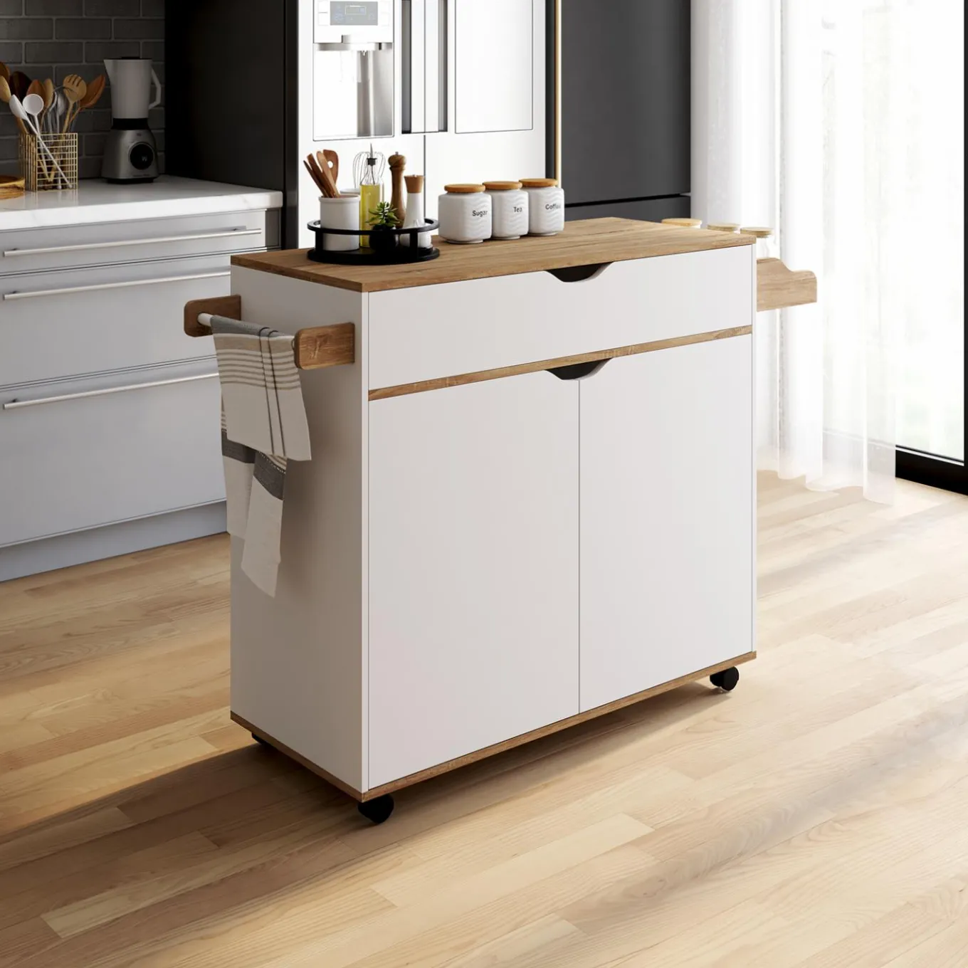 Découvrez la desserte à roulettes bois blanc et plateaux façon hêtre 90 cm COSY, moderne et pratique. Grâce à son placard, son tiroir, son porte-serviette et son range-épices, vous pouvez ranger des denrées et de la vaisselle pour tout garder à portée de main. Le véritable plus : une grande desserte de cuisine à roulettes à prix doux !