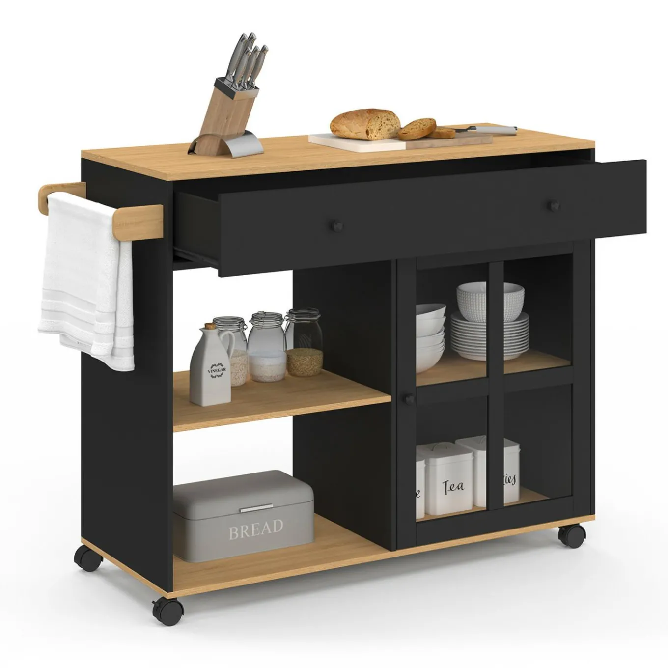 À la recherche d’une desserte à la fois pratique et chic ? Découvrez notre desserte de cuisine ACHILLE XXL au coloris bois et noir. Cette desserte, composée d’un placard à la porte vitrée, d’un tiroir, de deux étagères et d’un porte-serviette, vous permettra d’organiser tous vos condiments et denrées périssables, tout en les gardant à portée de main grâce à ses 4 roulettes directionnelles.