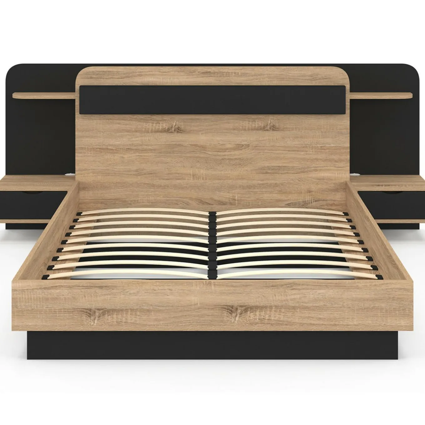 Lit double NATHAN 140 x 190 cm avec tête de lit, chevets suspendus, étagère, LED et sommier bois et noir