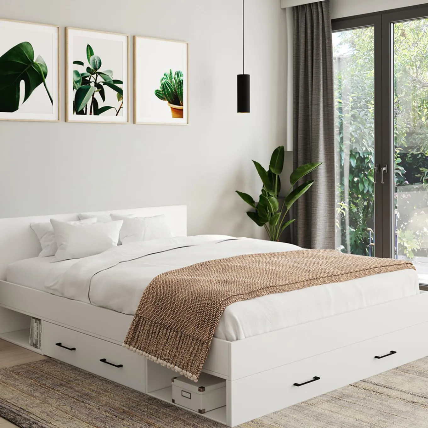 Le lit double blanc avec sommier complet clé en main MINEA, vous offre tout le nécessaire pour une chambre ordonnée, ergonomique et tendance. Entreposez votre linge de maison dans ses deux tiroirs et certains vêtements dans le rangement au pied du lit double avec rangement 140×190 cm.