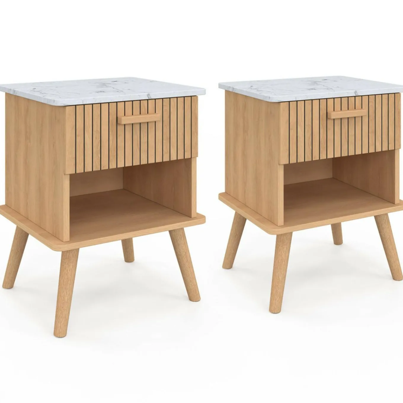 Lot de 2 tables de chevet JULIETTE plateau effet marbre 1 tiroir avec niche lattes tasseau bois