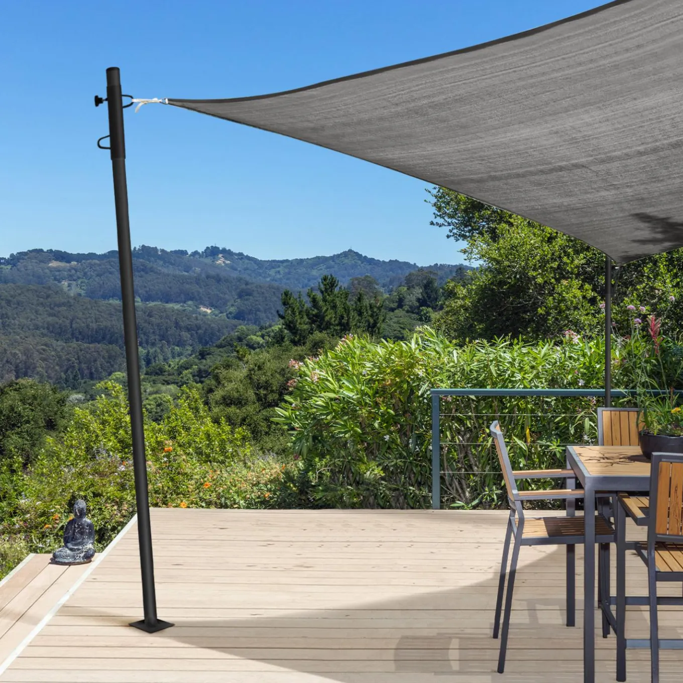 Adaptez votre ombrage selon vos envies à l’aide des doubles fixations réglables en hauteur. Grâce aux mâts en acier, votre voile d’ombrage peut atteindre une hauteur maximale de 220 cm : l’idéal pour installer votre salon de jardin juste en dessous !