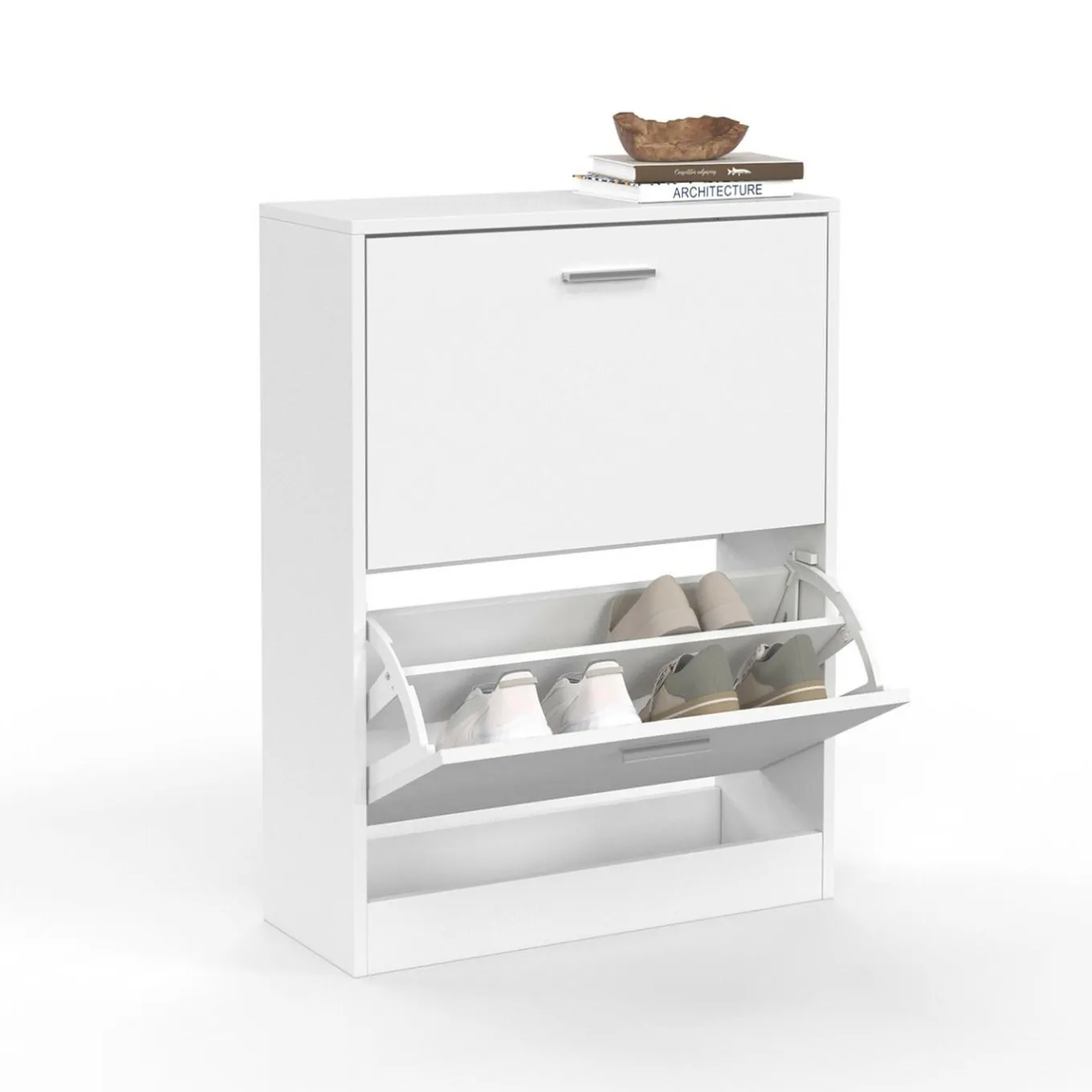 De couleur blanche, ce petit meuble pour chaussures s’intégrera parfaitement dans tous les types d’intérieurs. Il est à la fois design et fonctionnel et ravira les familles plus ou moins nombreuses. Doté de deux portes basculantes avec deux espaces de rangement, ce meuble à chaussures blanc s’avère extrêmement pratique. Vous pouvez y entreposer jusqu’à 12 paires de chaussures. Pour habiller votre meuble, placez une plante ou un joli objet de décoration dessus.