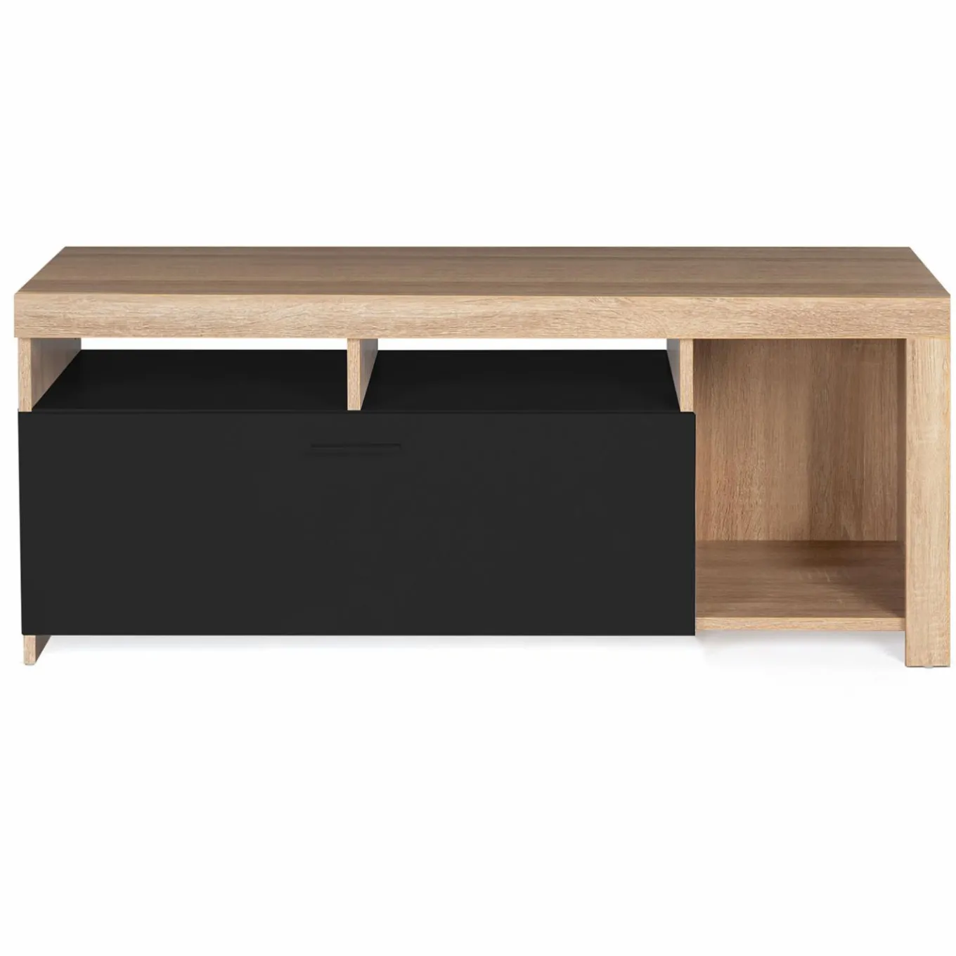La longueur de 110 cm de ce meuble télé noir et bois permet d’accueillir un écran plat de grandes dimensions, mais peut tout à fait trouver sa place dans une petite pièce. Vous vivez dans un petit appartement ? Ce meuble de largeur parfaite n’est pas gourmand en espace.