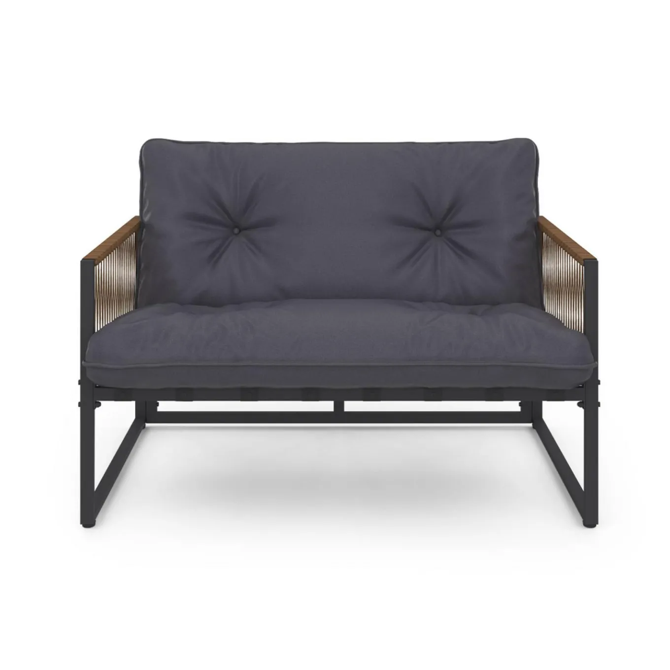 Salon de jardin bas RIO 4 places structure métal gris anthracite, cordage effet rotin avec coussin gris
