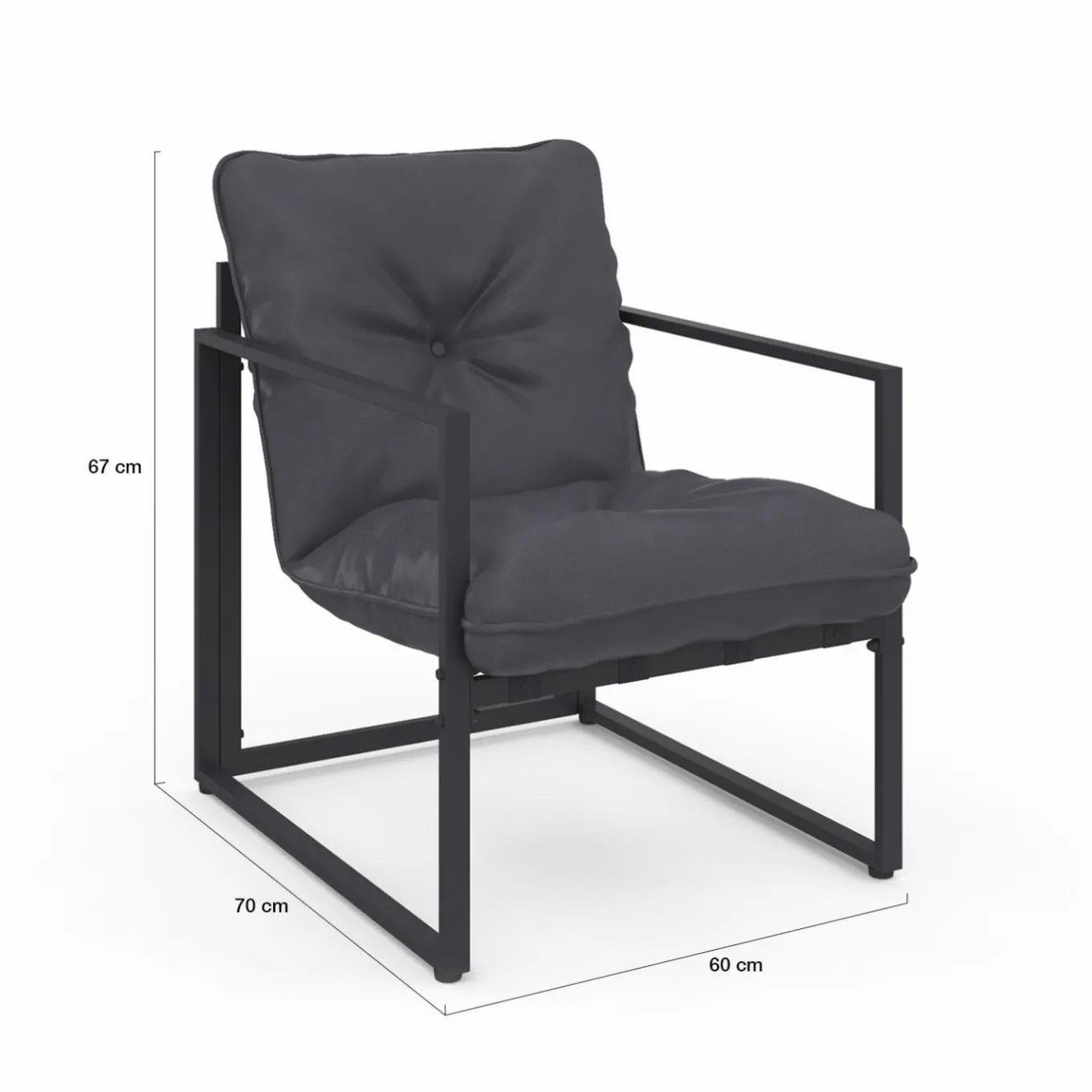 Ce salon bas est composé de 2 fauteuils de jardin acier et gris anthracite avec coussins confortables en polyester, d’une banquette et d’une table avec plateau en verre trempé.