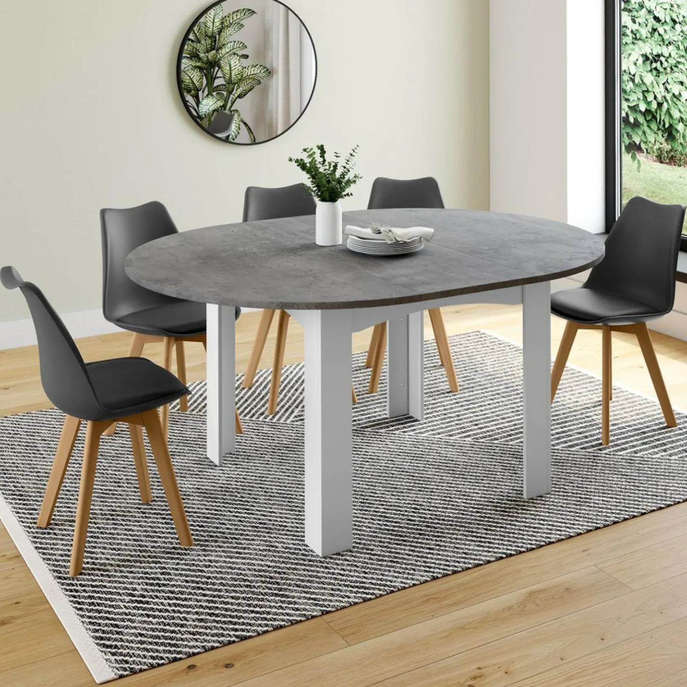 Vos invités sont partis ? Retirez la rallonge de 40 cm effet béton et retrouvez une table ronde 110 cm, parfaite pour vos repas de tous les jours.