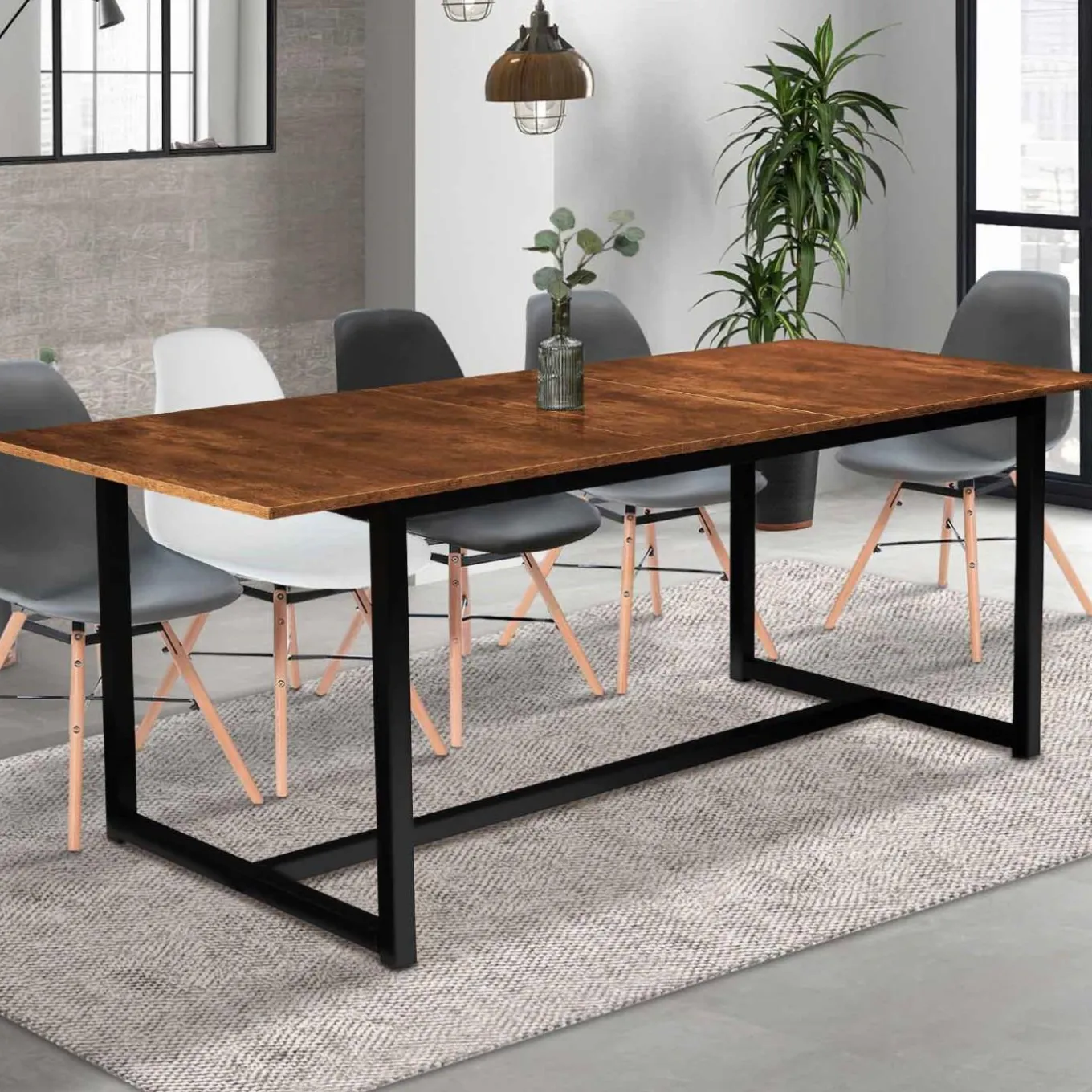 La couleur bois effet vieilli du plateau de la table à manger industrielle extensible 200 cm et les pieds en métal noir se fondront dans votre décoration, pour un effet tendance.