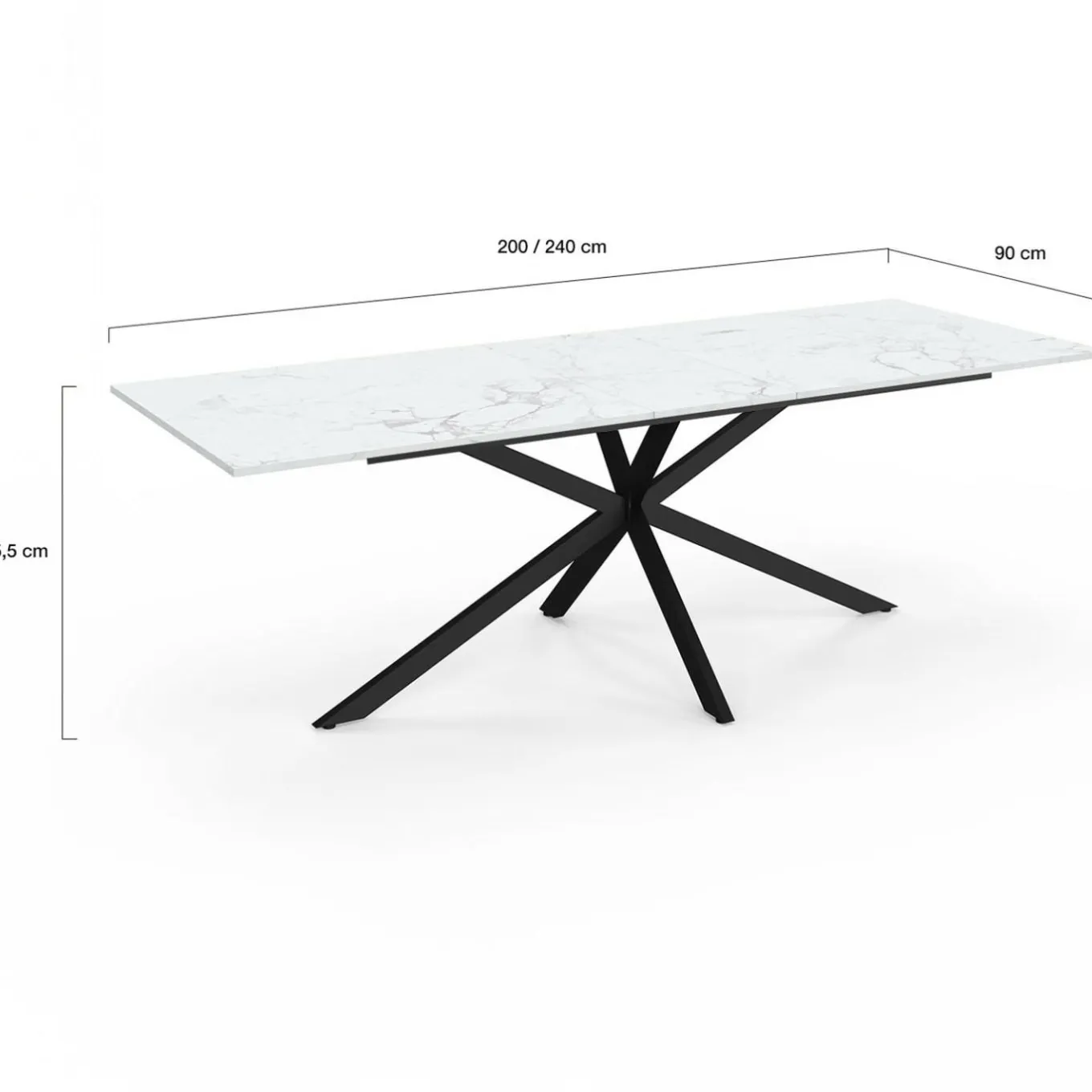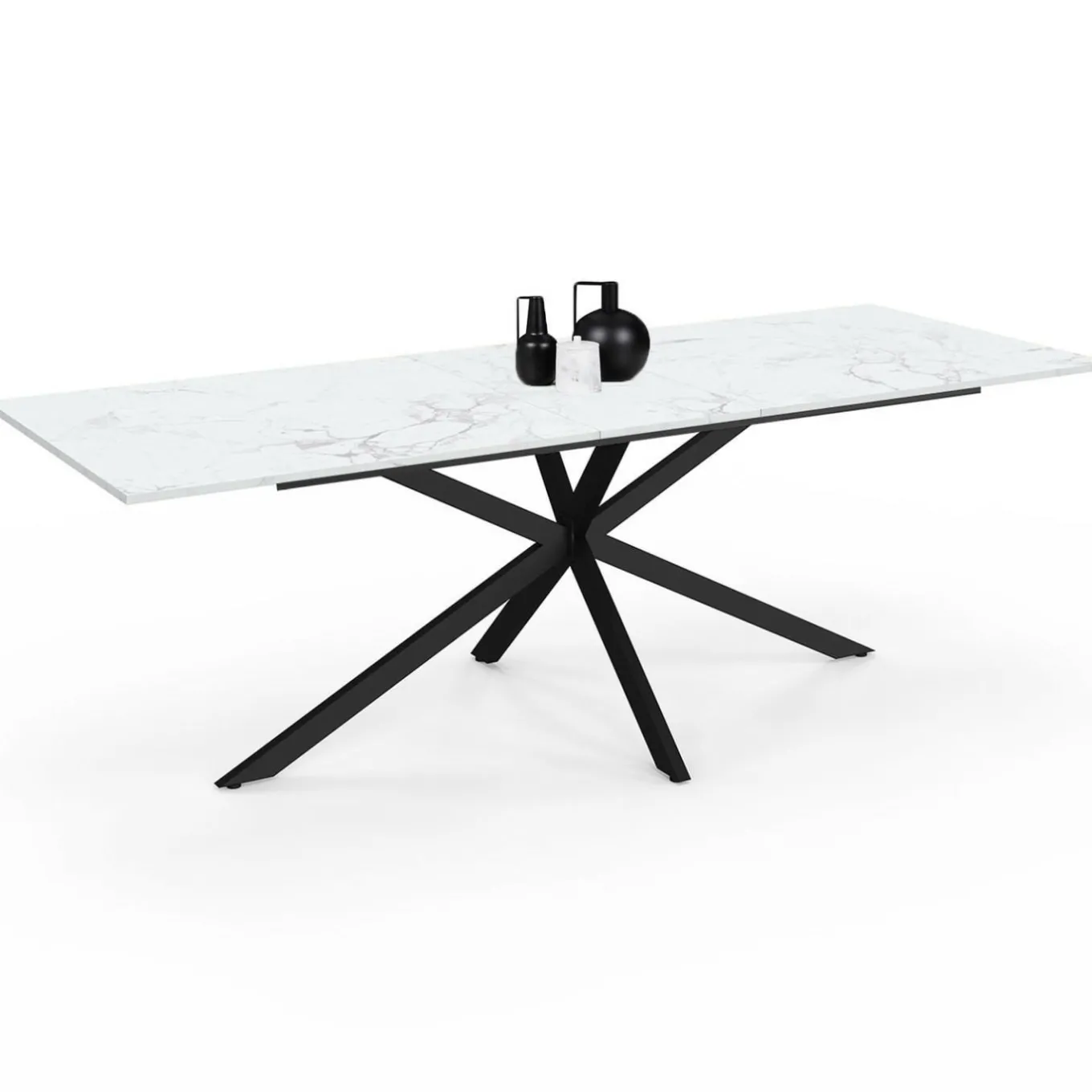 Table à manger extensible rectangle ALIX 8-12 personnes pied araignée noir plateau effet marbre blanc ALASKA 200-240 cm