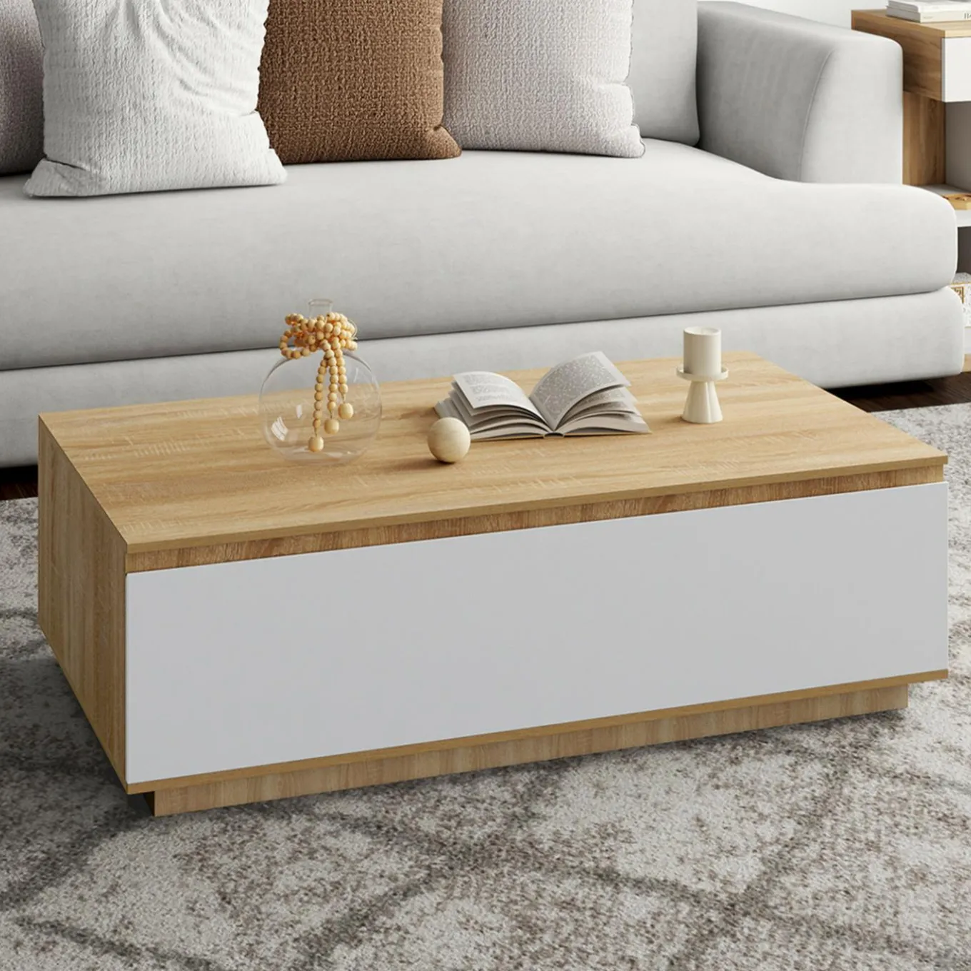 Avec cette table basse moderne dotée d’un abattant, vous profitez d’un meuble aussi esthétique que pratique. Alliant le charme chaleureux du bois clair et l’élégance d’un abattant noir mat, elle s’intègre parfaitement dans tous les intérieurs contemporains, scandinaves ou minimalistes.