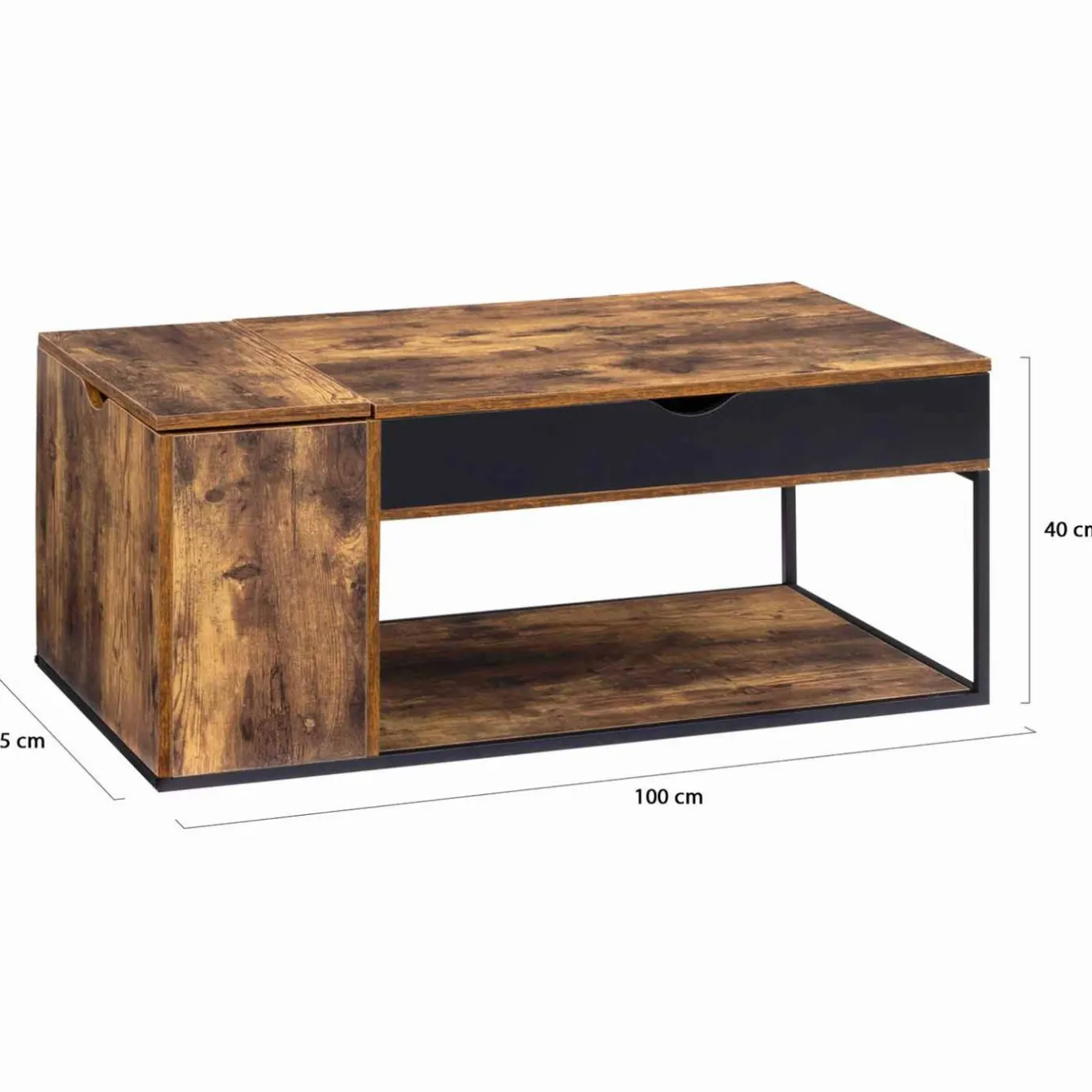 Craquez sans hésiter pour cette table basse au style industriel esprit factory. Pratiques, ses multiples espaces de rangement vous faciliteront la vie au quotidien : plateau relevable avec rangement en dessous, coffre latéral pour bouteilles et étagère inférieure pour disposer magazines et télécommandes ! Ses coloris bois effet vieilli et noir s’adapteront facilement à votre intérieur !