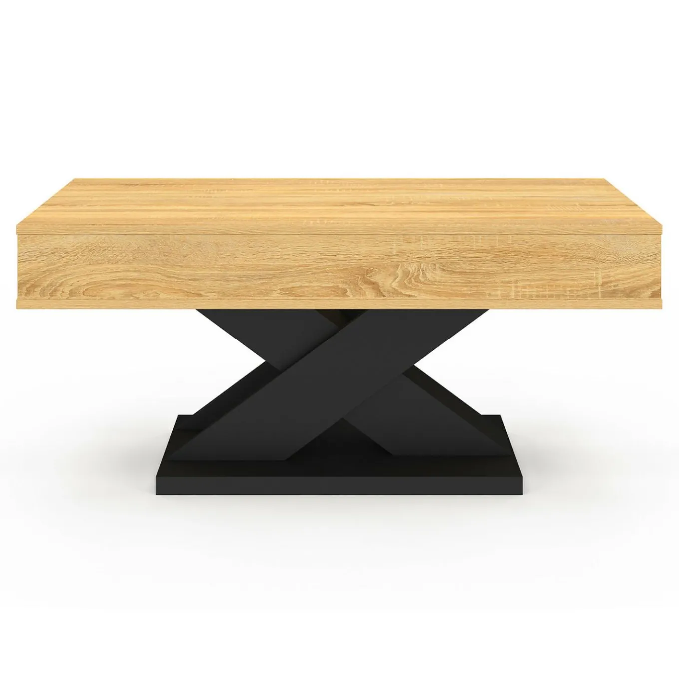 Avec son pied en forme de X noir et son plateau en bois clair, cette table basse relevable bois donne un effet bi-matière et apporte modernité et tendance dans votre intérieur.