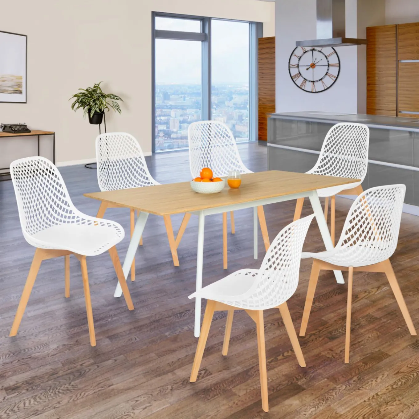 Envie de nouvelles chaises scandinaves couleur blanche à la fois design, stables et confortables ? Découvrez le lot de 6 chaises scandinaves MANDY, un vrai atout pour votre intérieur. Vous allez adorer le style graphique de leur dossier ajouré.