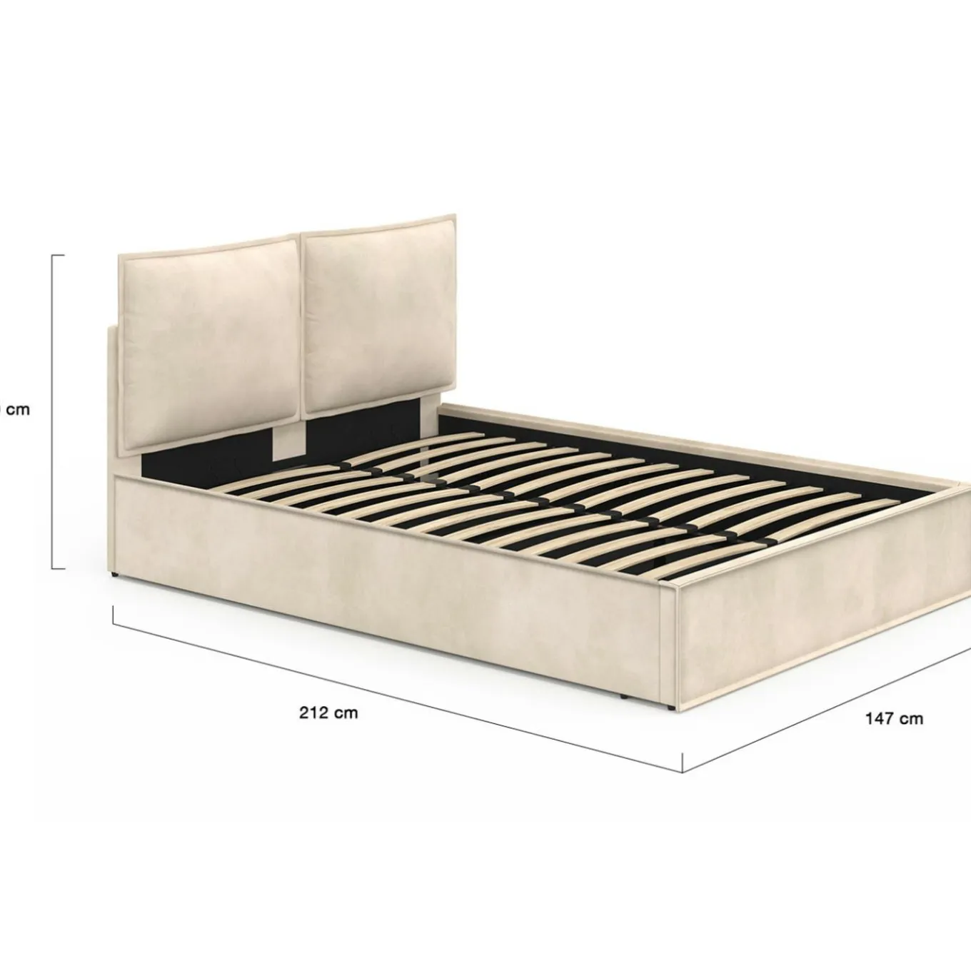 Doté d’une grande et confortable tête de lit matelassée à la forme de 2 oreillers rembourrés, ce lit coffre double habillera élégamment votre mur et vous apportera tout le confort nécessaire lorsque vous souhaitez vous y adosser pour lire un livre ou regarder la télé par exemple. Ses 2 oreillers donneront un style cocooning à votre chambre et son revêtement en velours beige vous apportera confort et réconfort; vous n’aurez ainsi plus envie de quitter votre lit !