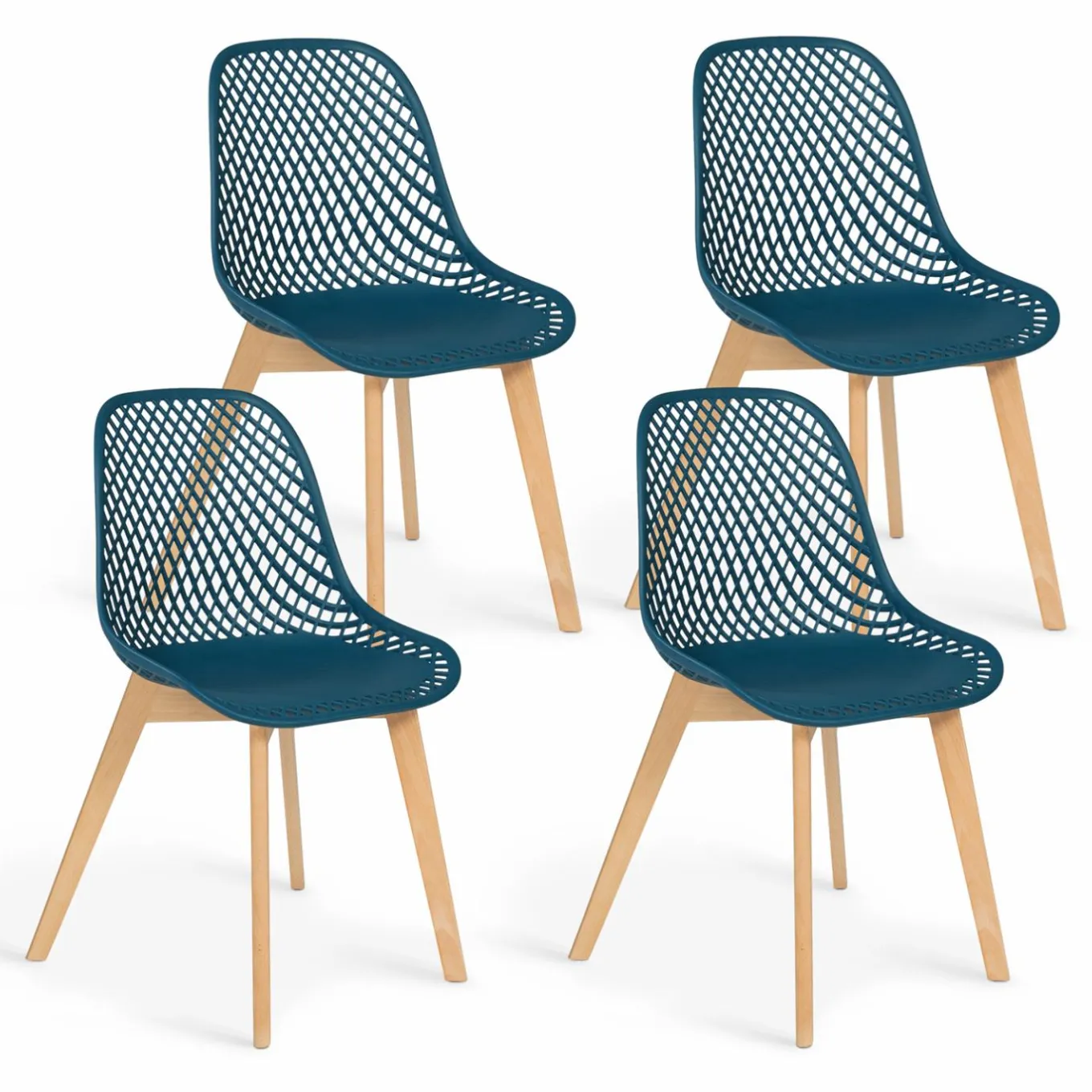 Vous apprécierez particulièrement le coloris bleu canard des chaises ajourées, qui donnera du peps au reste de votre décoration.