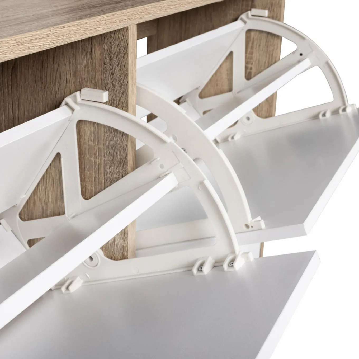 Il s’adaptera parfaitement à votre intérieur et habillera tous types de couloir ou d’entrée grâce à son design fonctionnel, chic et moderne ! Bicolore imitation hêtre et blanc, les coloris tendances de ce meuble à chaussures feront de votre vestibule un espace accueillant et bien rangé !