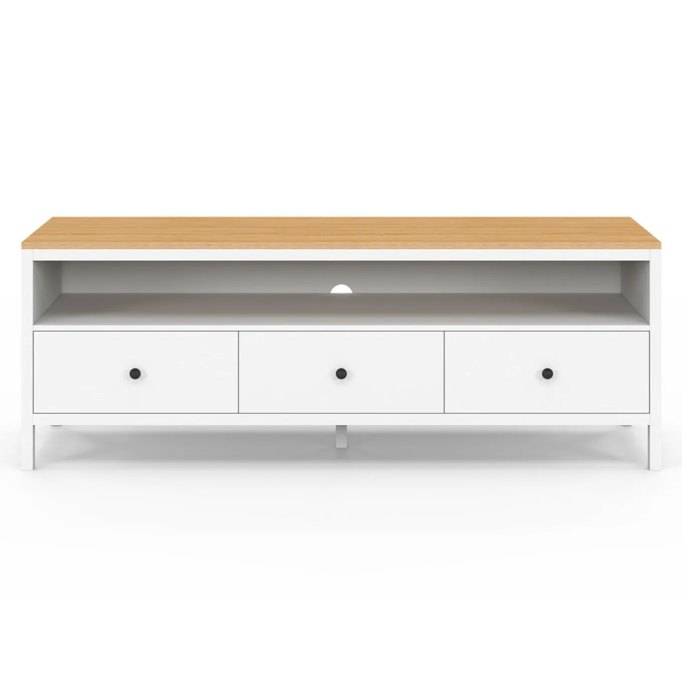 Meuble TV 140 cm ACHILLE 3 tiroirs blanc et plateau bois
