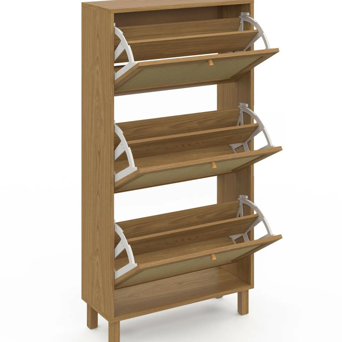 Pratiques et fonctionnels, les 3 compartiments de ce meuble de rangement de chaussures, dotés chacun d’une cloison intermédiaire, offrent une grande capacité de rangement et peuvent accueillir jusqu’à 18 paires de chaussures, soit 6 paires par compartiment.