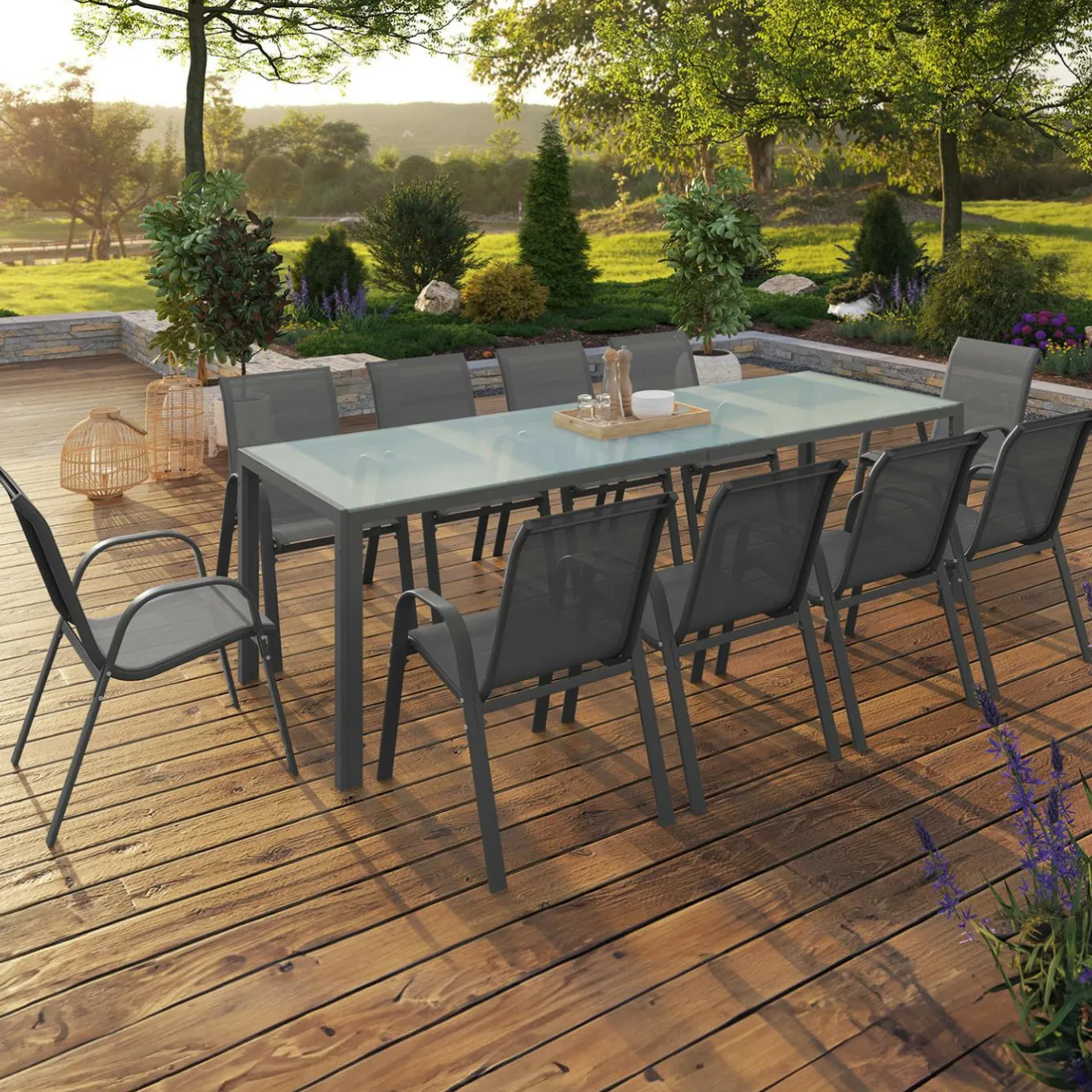 Profitez pleinement des beaux jours avec ce salon de jardin table 240 cm 10 chaises empilables gris anthracite à prix attractif et conçu pour durer !