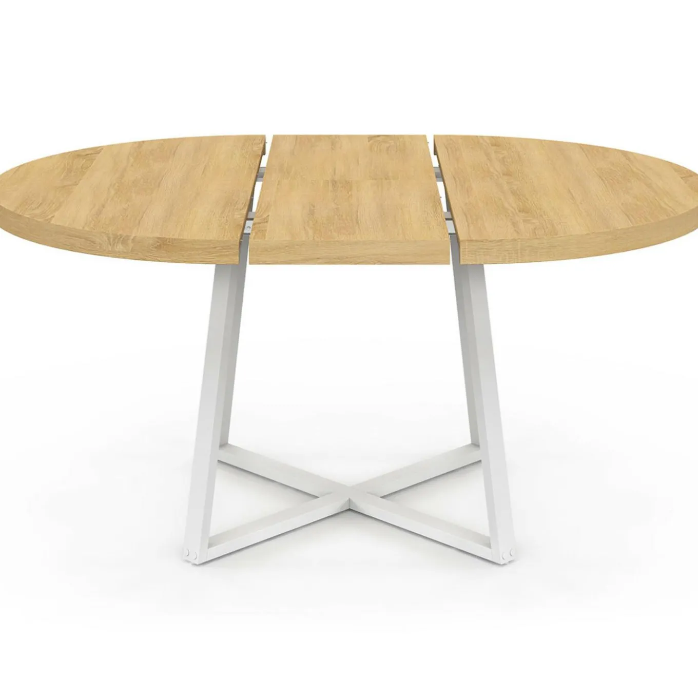 La couleur bois du plateau en particules de la table ronde extensible SELMA associé aux pieds en métal blanc apporte chaleur et authenticité à votre repas. De plus, le design travaillé du piètement de cette table à manger extensible lui donne un look ultra tendance !