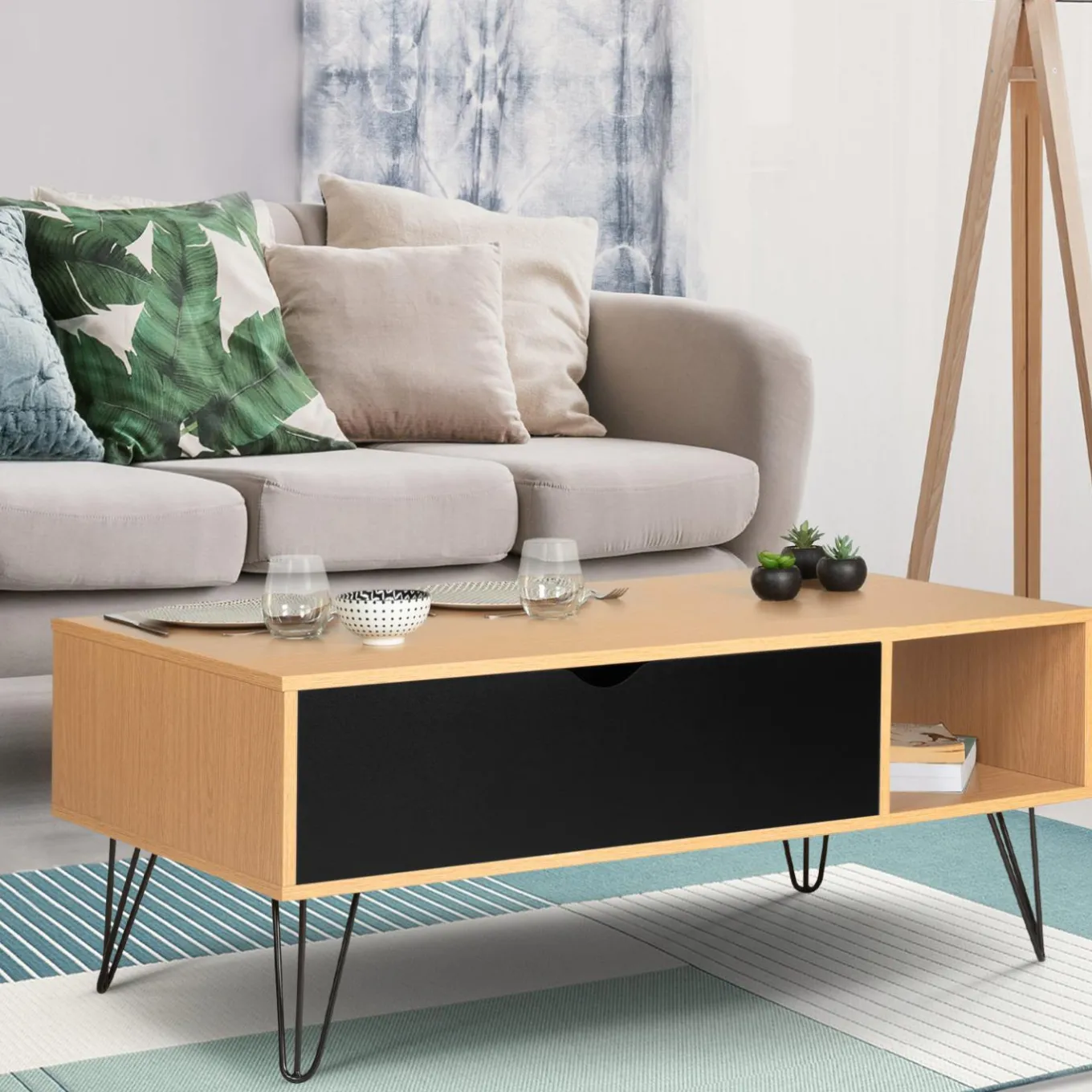 Esthétique et élégant, le contraste harmonieux entre la couleur naturelle bois de la table et son compartiment noir avec poignée à encoche discrète habillera joliment votre intérieur avec classe et chic.