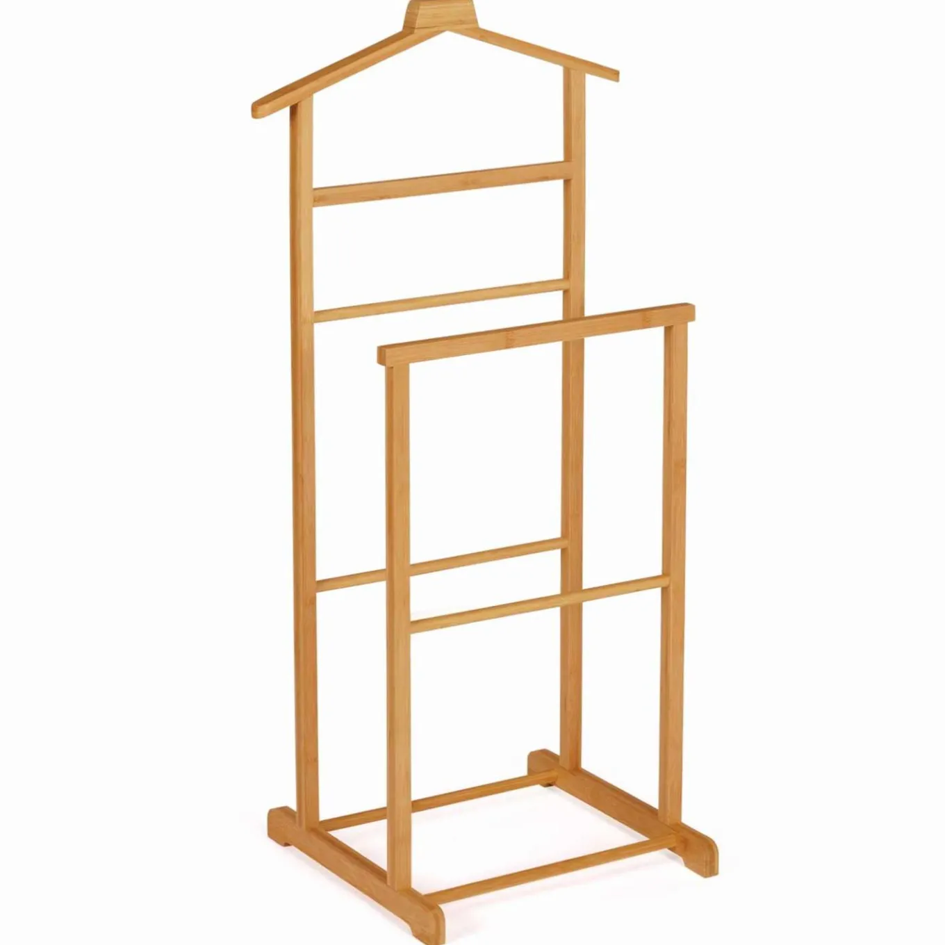 Le valet de nuit en bois dispose d’un cintre pour y déposer vos vestes et manteaux, d’une traverse pour suspendre les pantalons, cravates, robes, et d’un support pour y glisser vos chaussures. Très complet, ce portant à vêtements facilite ainsi le rangement de vos affaires.
